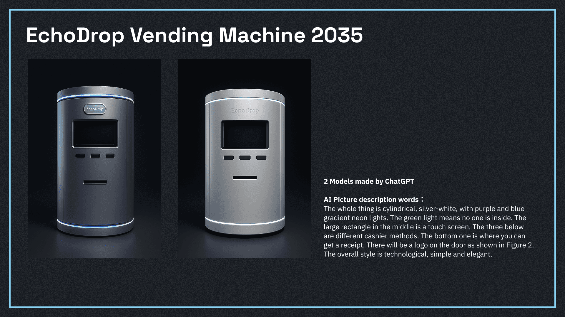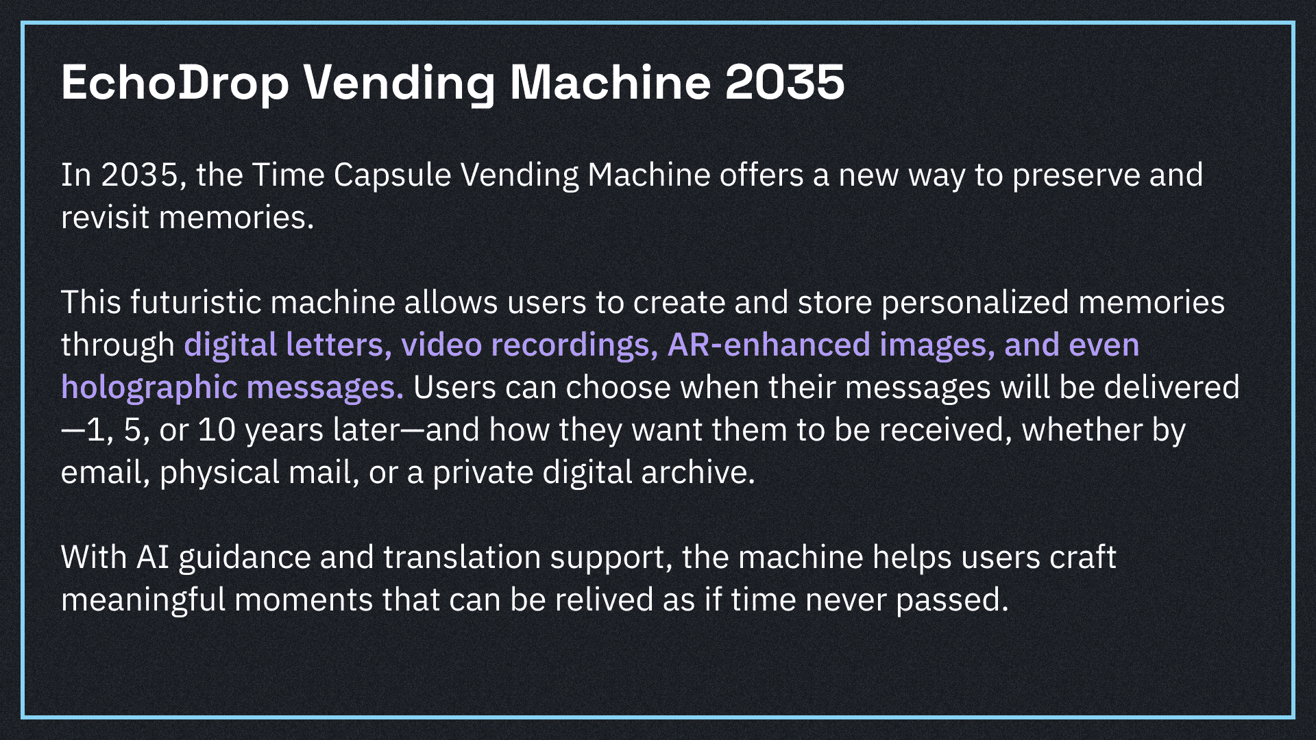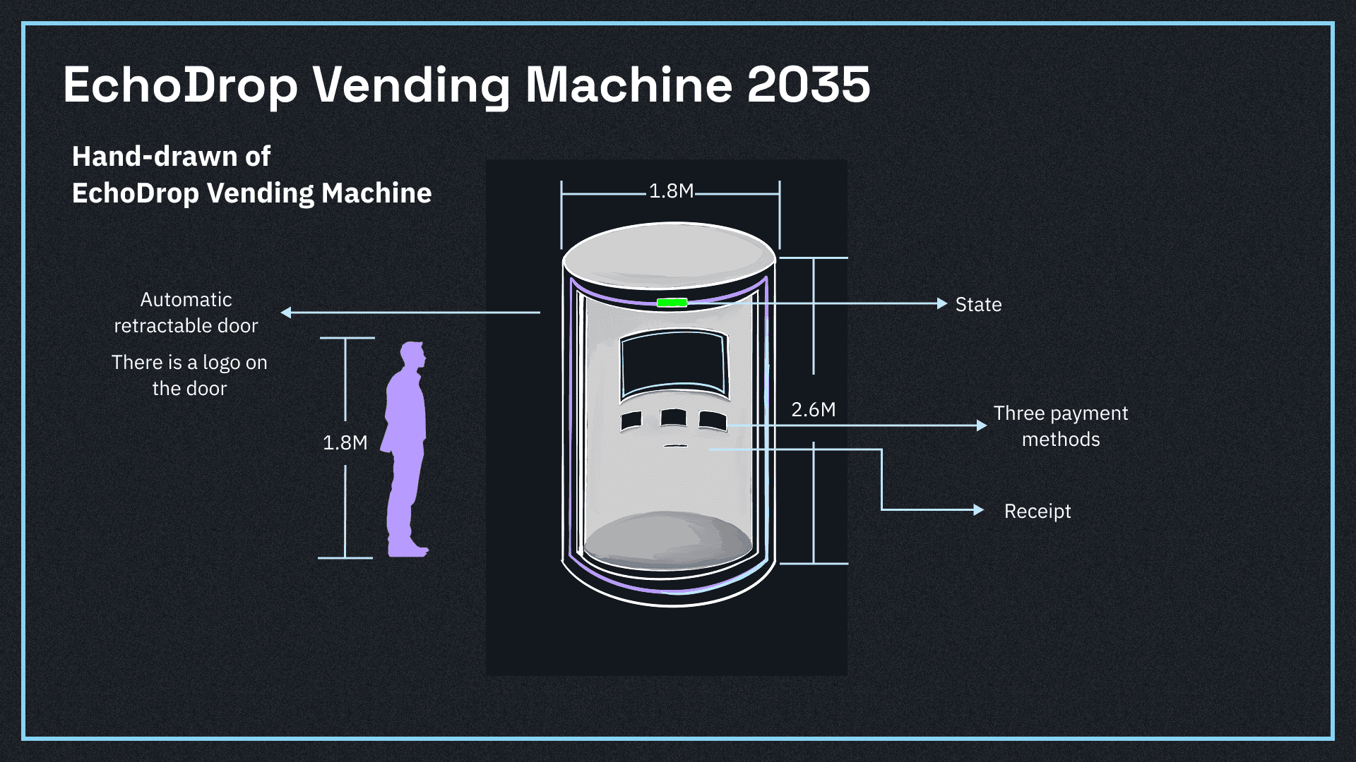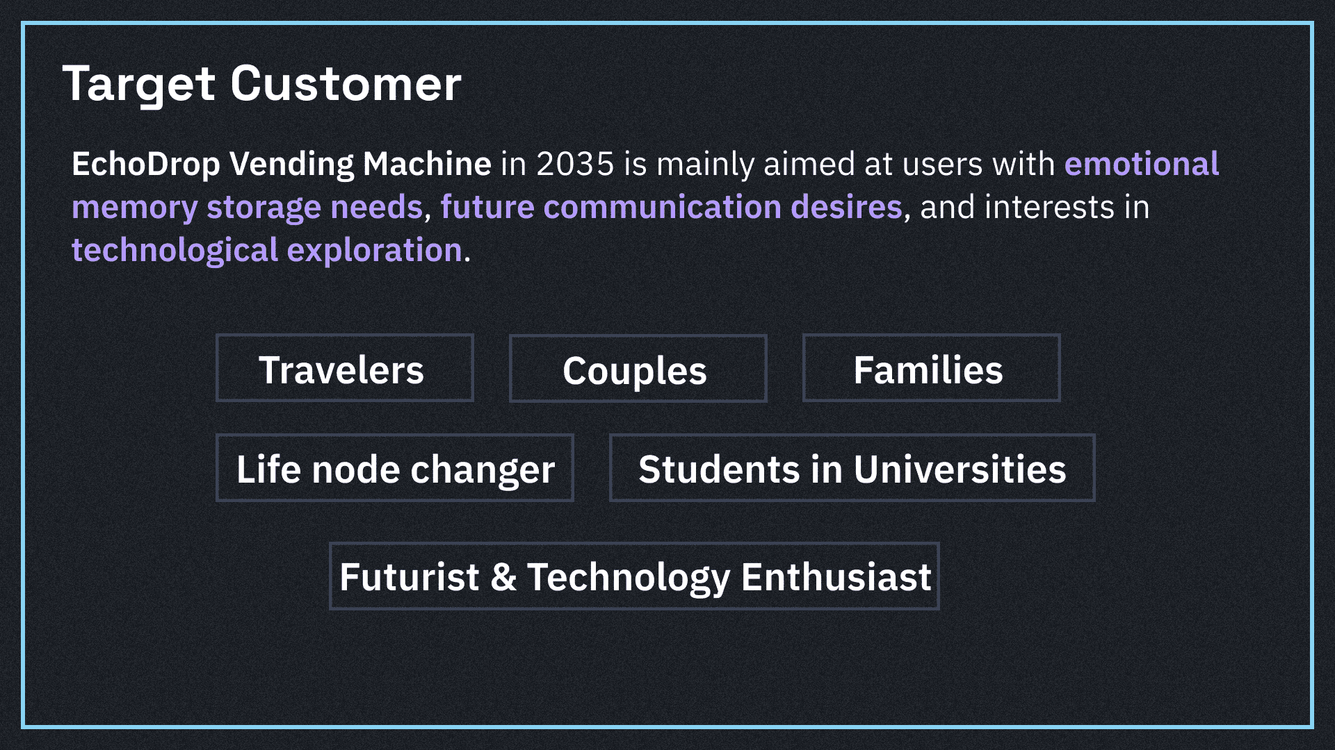 EchoDrop is a vending machine project showcasing the future, primarily aimed at users in 2035 with needs for emotional memory storage, desires for future communication, and interests in technological exploration.